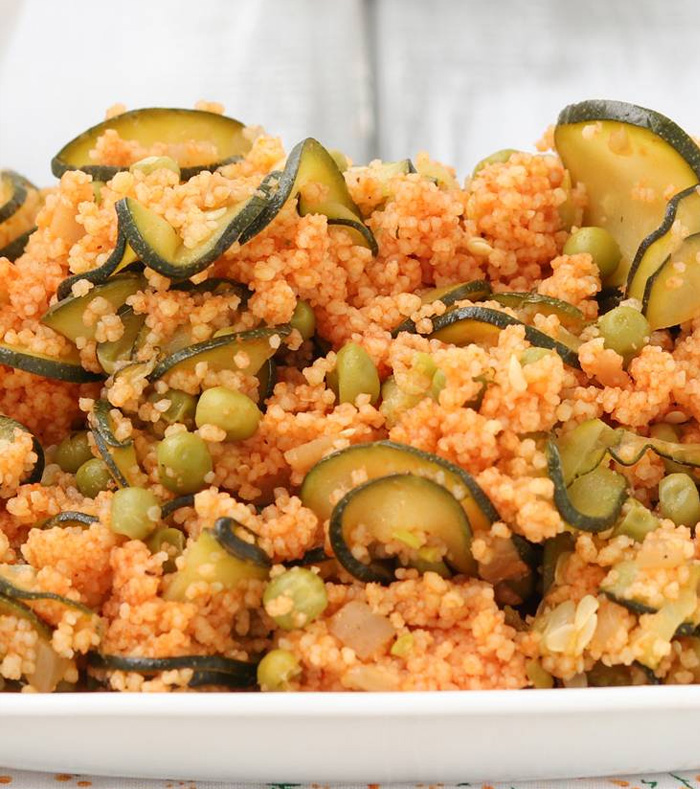 Couscous mit Zucchini und Erbsen ist ein einfaches Gericht, das als erster Gang serviert wird. Es ist schmackhaft und einfach zuzubereiten. Ein gesundes, nahrhaftes Gericht, das auch kalt sehr gut schmeckt und perfekt zum Mitnehmen ist, ins Büro, ans Meer, wohin Sie wollen, und es wird Groß und Klein wunderbar schmecken!